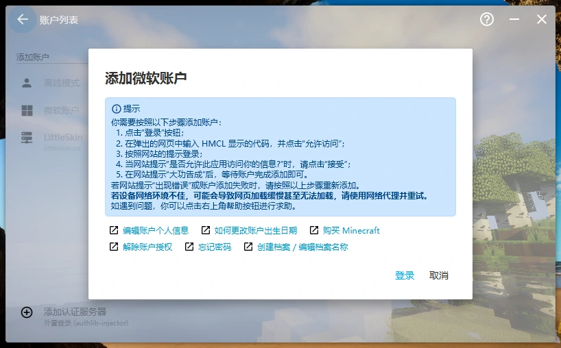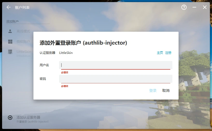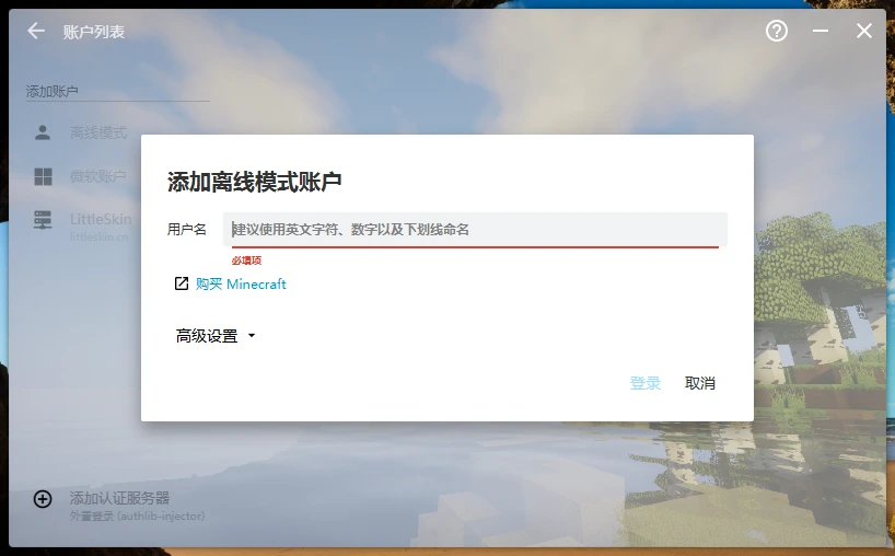 - 如购买过正版《我的世界》,点击左侧的微软账户,按照提示流程完成登录。如有LittleSkin账户,点击左侧的LittleSkin,按照提示流程完成登录。否则点击离线模式,填入用户名创建账户登录。