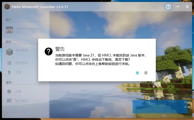 点击“是”,等待下载安装Java 21完毕,启动游戏。